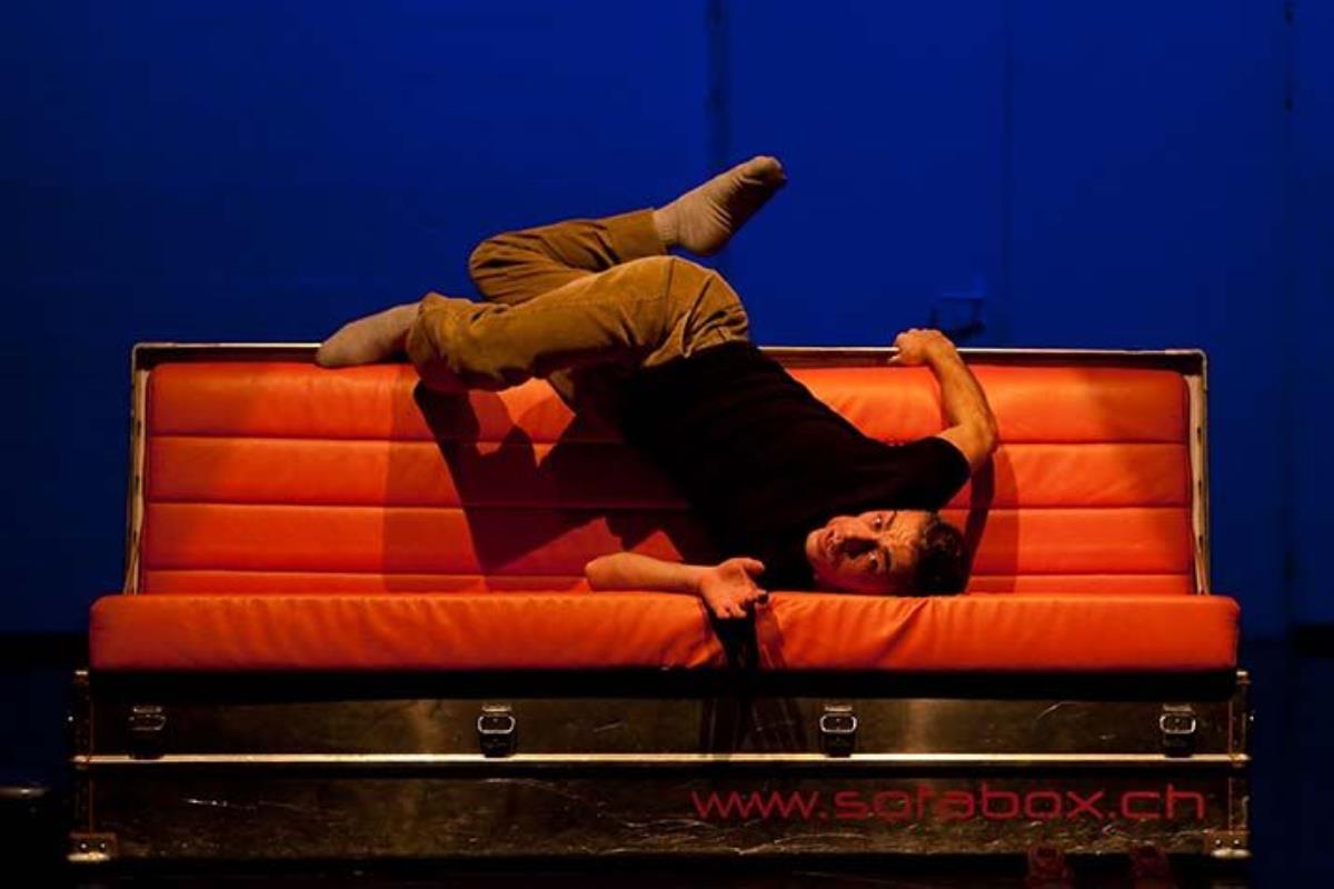 A sofabox is frontally placed in the middle of the scene to recreate an abstract image of reality.