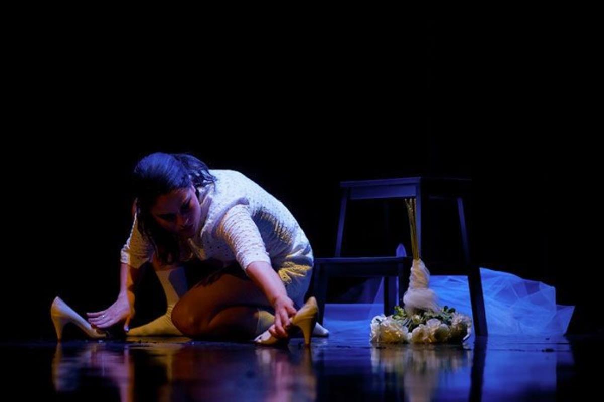 Eine Frau steht auf einem Podest. Ein Vehikel von Abstieg und Erhöhung.