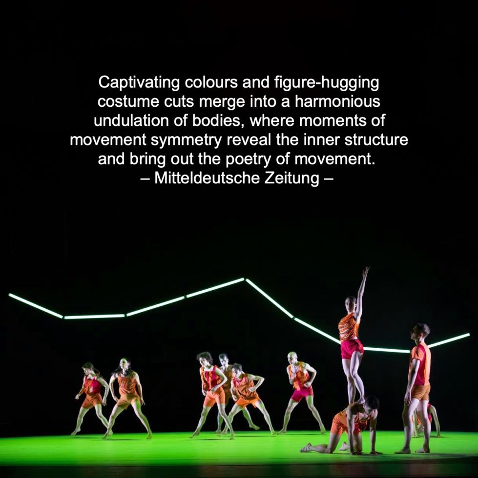 “Captivating colours and figure-hugging costume cuts merge into a harmonious undulation of bodies, where moments of movement symmetry reveal the inner structure and bring out the poetry of movement.” – Mitteldeutsche Zeitung